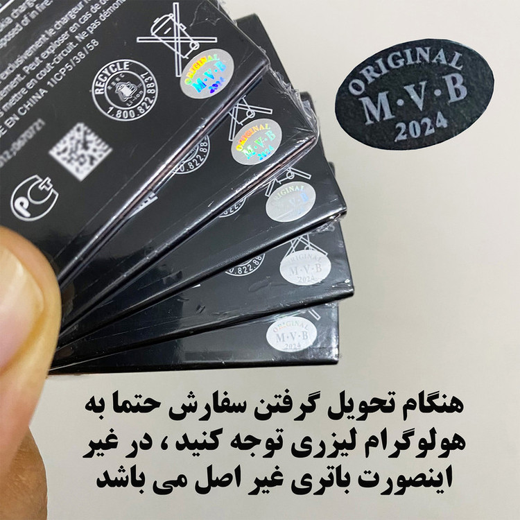 در بازار باتریهای موبایل، نمونههای تقلبی زیادی وجود دارند که میتوانند به دستگاه شما آسیب بزنند. باتریهای بیکیفیت معمولاً عمر کوتاهی دارند و ممکن است باعث داغ شدن یا خرابی گوشی شوند. باتریهای ما با کیفیت بالا و هولوگرام لیزری اصالت MVB عرضه میشوند که تضمینکننده اصل بودن محصول است. لطفاً هنگام دریافت سفارش، حتماً به هولوگرام توجه کنید—در صورتی که باتری با هولوگرامی غیر از MVB ارسال شده باشد، امکان مرجوعی وجود دارد.